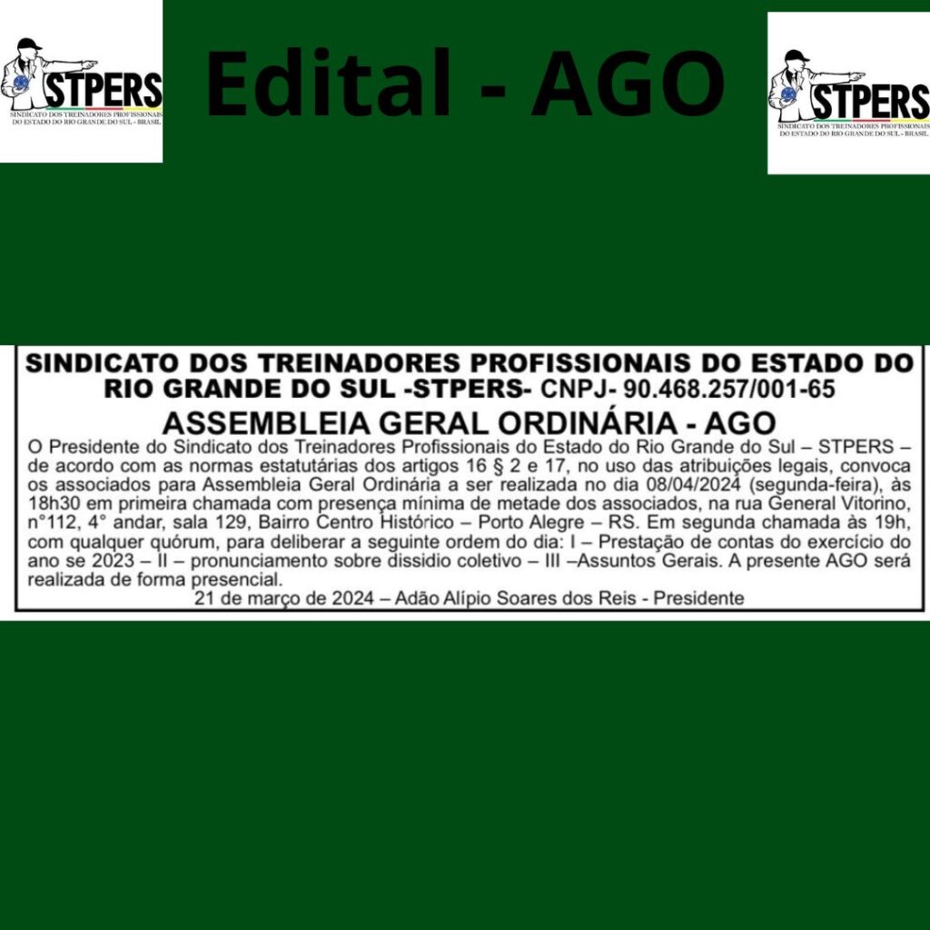 O Presidente do Sindicato dos Treinadores Profissionais do Estado do Rio Grande do Sul – STPERS – de acordo com as normas estatutárias dos artigos 16 § 2 e 17, no uso das atribuições legais, convoca os associados para Assembleia Geral Ordinária a ser realizada no dia 08/04/2024 (segunda-feira), às 18h30 em primeira chamada com […]