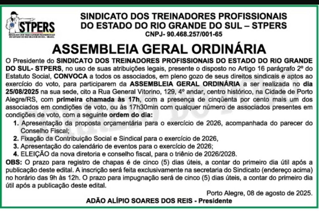 O Presidente do SINDICATO DOS TREINADORES PROFISSIONAIS DO ESTADO DO RIO GRANDE DO SUL- STPERS, no uso de suas atribuições legais, presente o disposto no Artigo 16 parágrafo 2º do Estatuto Social, CONVOCA a todos os associados, em pleno gozo de seus direitos sindicais e aptos ao exercício do voto, para participarem da ASSEMBLEIA GERAL […]