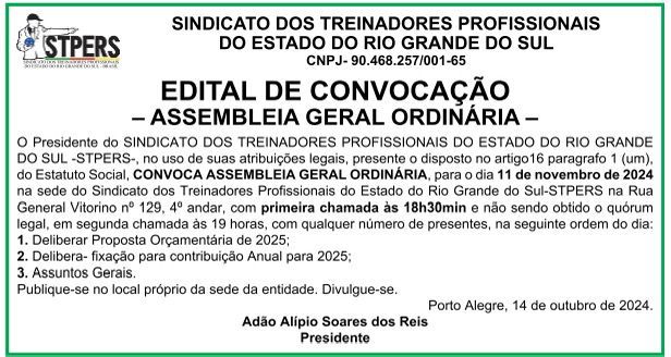 O Presidente do SINDICATO DOS TREINADORES PROFISSIONAIS DO ESTADO DO RIO GRANDE DO SUL – STPERS -, no uso de suas atribuições legais, presente o disposto no artigo 16 parágrafo 1 (um), do Estatuto Social, CONVOCA ASSEMBLEIA GERAL ORDINARIA, para o dia 11 de novembro de 2024, na sede do Sindicato dos Treinadores Profissionais do Estado do Rio Grande do Sul – STPERS na Rua General Vitorino n°129, 4° andar, com primeira chamada às 18h30min e não sendo obtido o quórum legal, em segunda chamada às 19horas, com qualquer número de presentes, na seguinte ordem do dia: