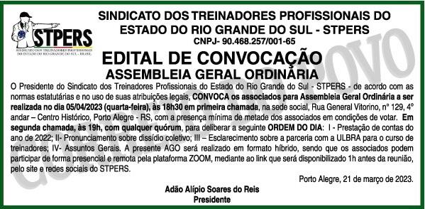 O presidente do Sindicato dos Treinadores Profissionais do Estado do Rio Grande do Sul – STPERS – de acordo com as normas estatutárias e no uso de suas atribuições legais, CONVOCA os sócios para Assembleia Geral Ordinária a realizar-se dia 05/04/2023, às 18h30 em primeira chamada, na sede social (Rua General Vitorino, n. 129, 4º.Andar-Centro, Porto Alegre- RS), em primeira chamada com a presença mínima de metade dos associados em condições de votar e, se necessário, em segunda chamada, 30 minutos (19h) após, com qualquer quórum, para deliberar a seguinte ORDEM DO DIA: I – prestação de contas do exercício anterior; II- pronunciamento sobre relações ou dissídio coletivo; III – esclarecimento sobre convênio com a ULBRA para formação de treinadores; IV- Assuntos Gerais. A presente AGO será realizado em formato híbrido, sendo os associados podem participar de forma presencial e de forma remota pela plataforma ZOOM, mediante ao link que será disponibilizado 1h antes da reunião, pelo site e redes sociais do STPERS.